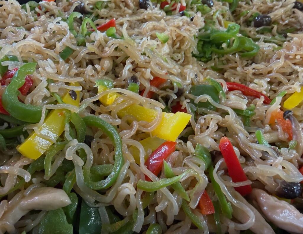 ピーマンとパプリカが入った、糸コンチャプチェ。糸こんにゃくは念入りに炒り炒り。しっかり水を飛ばすとても大事な工程。時間はかかりますが、その分味が染みやすくとても美味しくなります。味付けは、オイスターソースやコチュジャン、豆板醤など。旨味と辛味を味わってください。