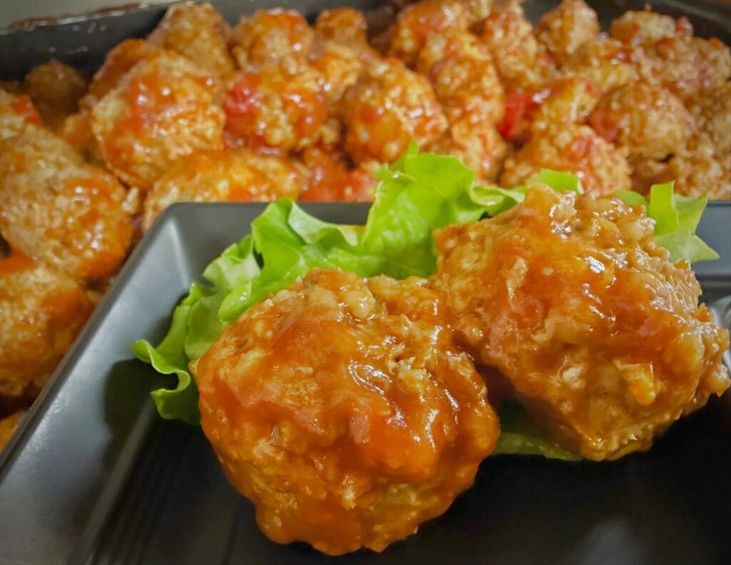 もち麦のプチプチ食感が癖になる肉団子。中華甘酢とケチャップのみんなが大好きな味に仕上がってます。