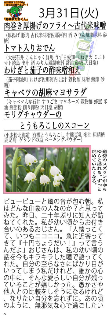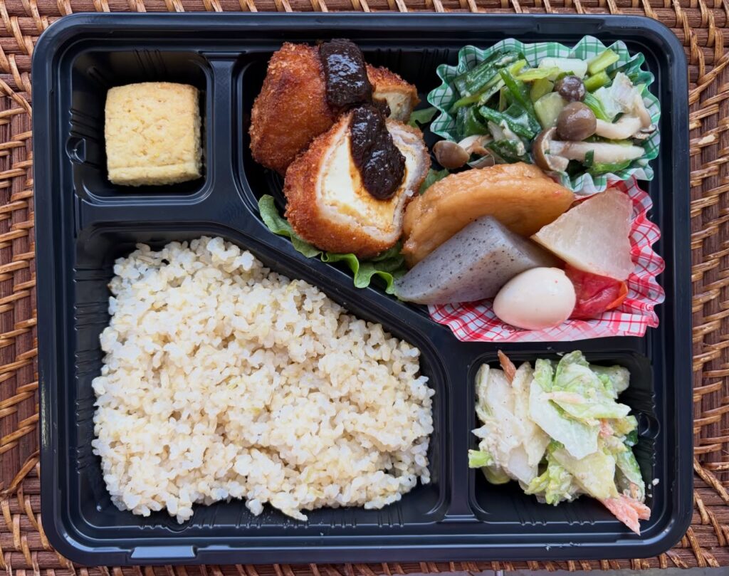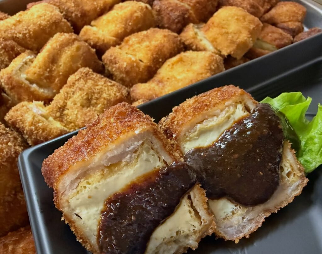 塩麹に漬けた厚揚げを豚肉で巻いてフライにしました。古代米味噌で召し上がれ。