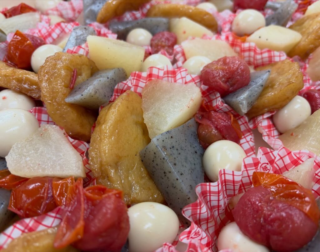 ミニトマト、こんにゃく、大根、うずらのたまご、玉ねぎ天が入ったおでんです。しみしみおでんをお楽しみください。
