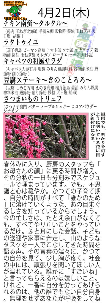 ふんわり下処理したとりむね肉を一つ一つ丁寧に揚げて甘酢タレに。ゆで卵を作って手作りしたタルタルソースはチキンにピッタリの味付けになっています![]()