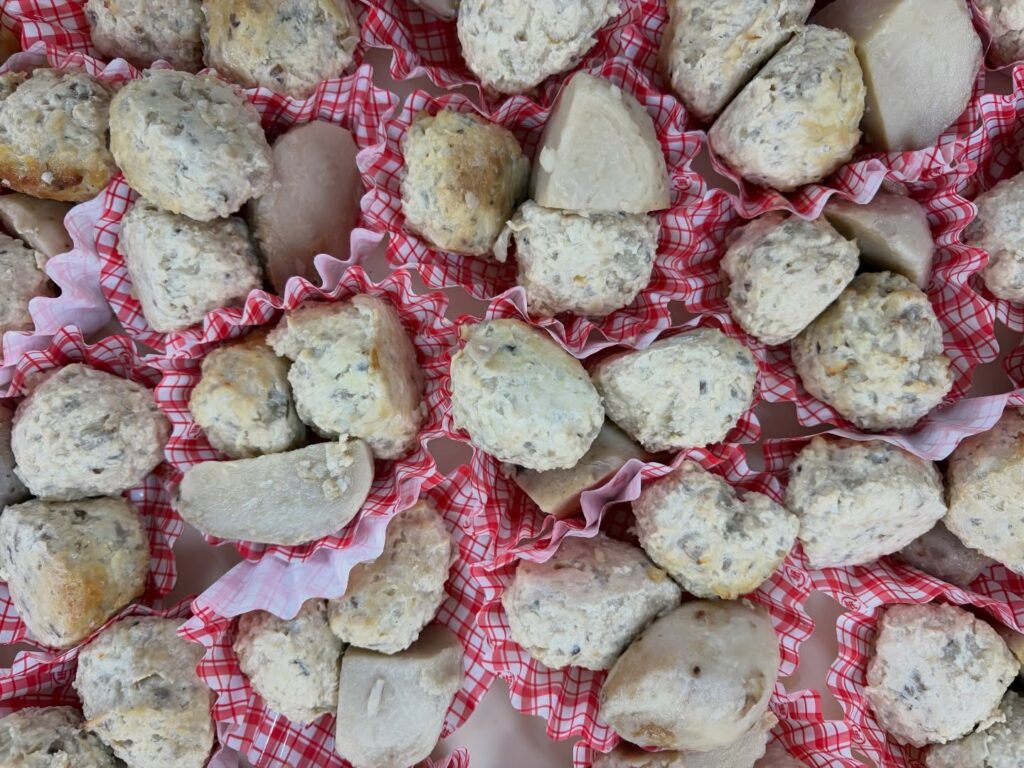 つくね団子は、鶏肉ミンチ、豆腐、ごぼうが入って、ふわふわの中にごぼうの食感が楽しい一品に。