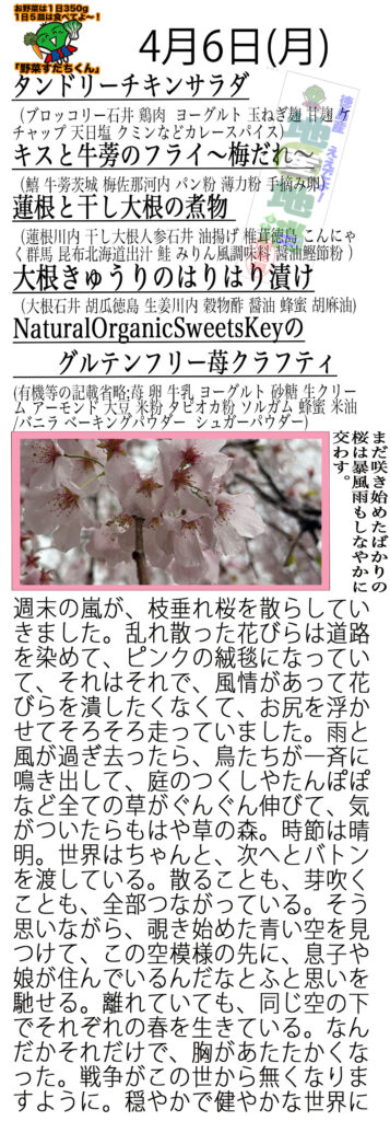 週末の嵐の勢いすごくてこわかったのですが、皆さんはいかがお過ごしでしたか?枝垂れ桜の名所神山の街道沿いの見事な桜もを容赦なく散らしていきました。