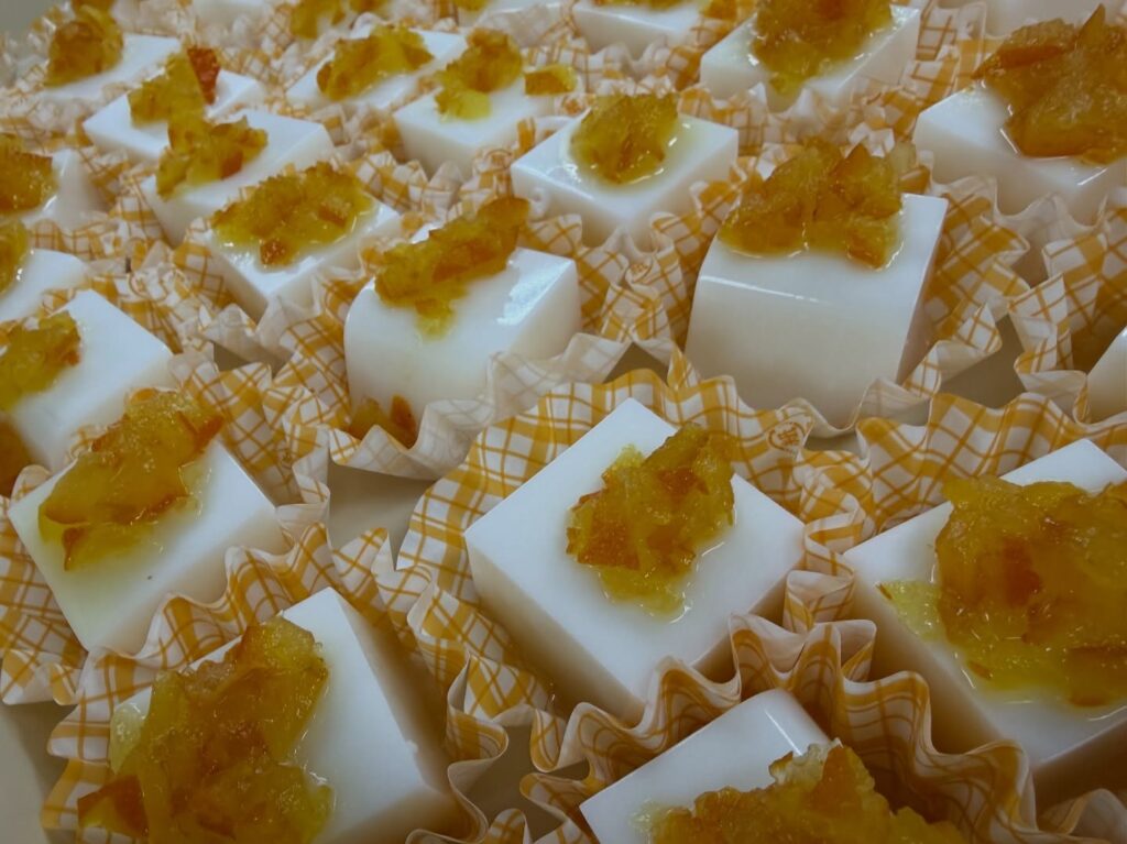やさしい甘さのミルク寒天に金柑のコンポートを乗せました。金柑が爽やかです。