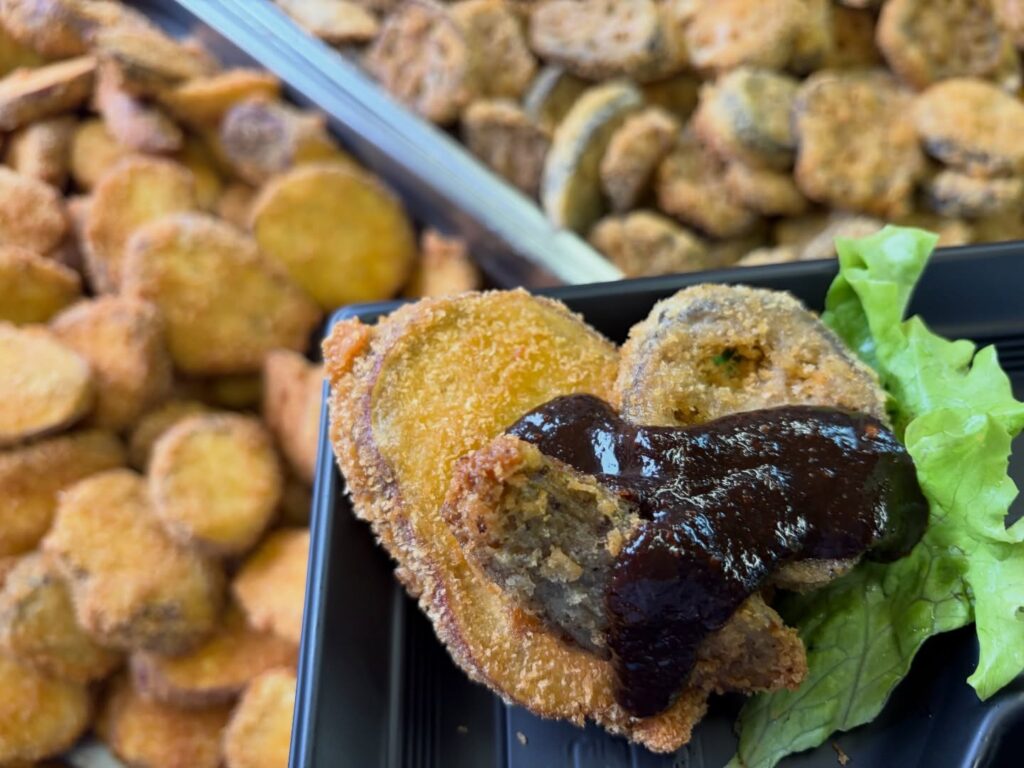 さつまいも、ごぼう、れんこんを柔らかく蒸してから衣をつけてフライにしました!手作りの古代米味噌タレで♡
