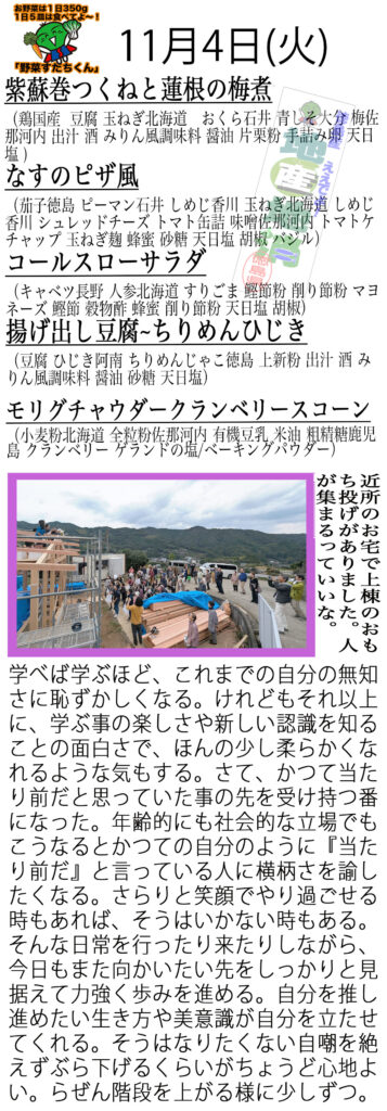 それにしても、佐那河内では10数年ぶりのもち投げだったそう。今は上棟式を地域の人とお祝いすること自体が、すっかり珍しくなりました。きっと素敵なお家ができるだろうなと、今から楽しみです。さて、今日のお弁当の紹介です。