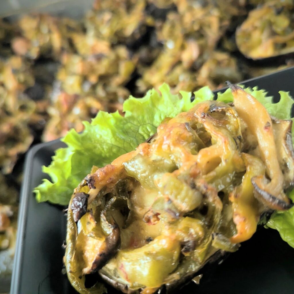 ナスを大きくスライスして、ピーマンたっぷりのピザソースをのせて焼きました。