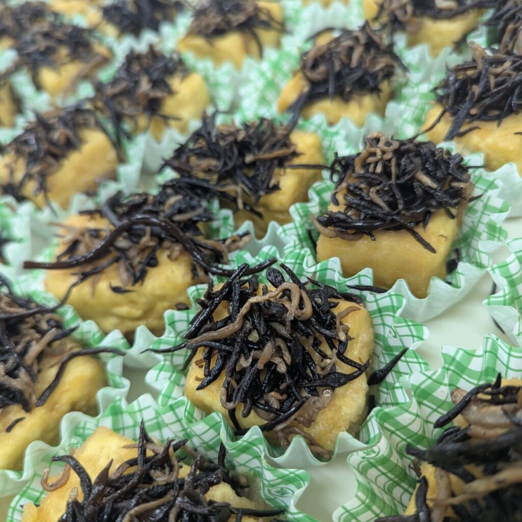 上新粉をまぶして揚げた豆腐を、阿南のひじきと徳島のちりめんじゃこで作った出汁だれに漬け込んでいます。
